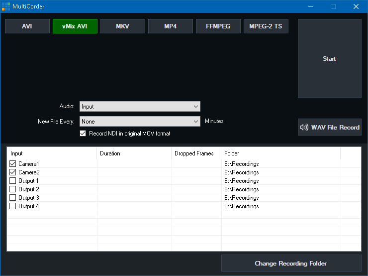 All available Camera and NDI inputs are listed within the MultiCorder window along with the four Output channels. Tick the source you wish to record and click Start.