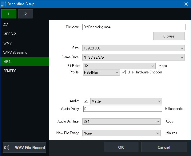 3. Recording: If you have an NVIDIA graphics card installed and Windows 10 or Windows 11, try recording to MP4 with 'Use Hardware Encoder' enabled. This will reduce CPU usage: