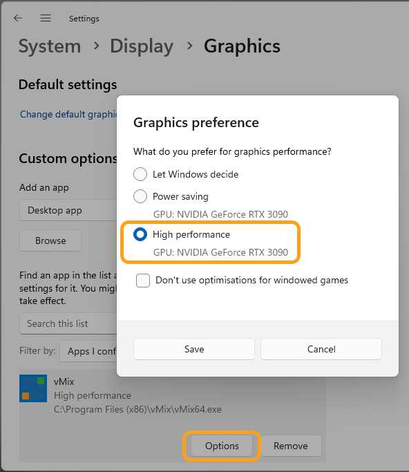 Find vMix in the list, then click on Options and set it to to 'High performance'.
