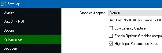 6. If Resizable BAR is not available for your hardware, but your graphics card supports 3GB of memory or higher, then turn on 'High Input Performance Mode' in vMix Settings under the Performance tab.