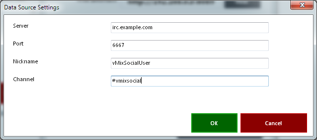 vMix SocialData Source IRC Enter in the Server, Port, Nickname and Channel to begin downloading IRC messages.